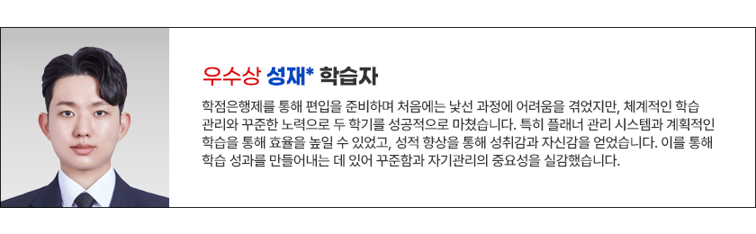 제 노하우는 거창한 비법보다는 ‘철저한 계획’과 ‘성실함’입니다. 저는 TESAT이나 SMAT 같은 자격증 시험과 편입 영어를 동시에 준비해야 했기에, 강의를 절대 미루지 않는 것을 제 1의 원칙으로 삼았습니다. 매일 정해진 시간에 강의를 수강하고, 학습 자료를 꼼꼼히 회독하며 중요한 개념은 따로 정리해 나갔습니다. 특히 과제나 토론, 중간·기말고사 등 성적에 반영되는 모든 과정에 ‘애살있게’ 임하며 작은 부분 하나 놓치지 않으려 노력한 것이 전교 1등이라는 좋은 결과로 이어진 것 같습니다.